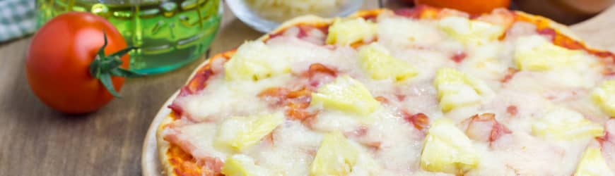 Gesneden fruit op sap waaronder, ananas, peer, perzik, druiven en aardbeien.